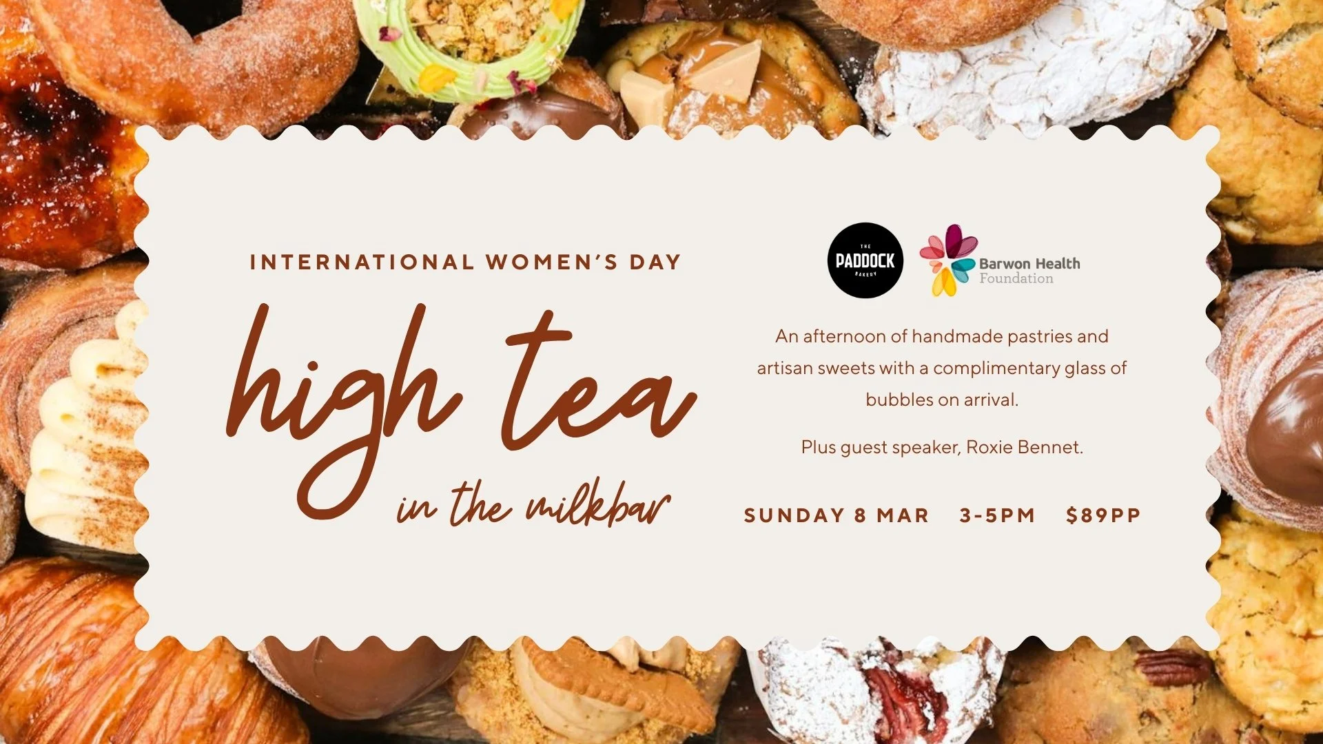 An afternoon of handmade pastires, artisan sweets, local teas, barista made coffee and a complimentary glass of bubbles on arrival.